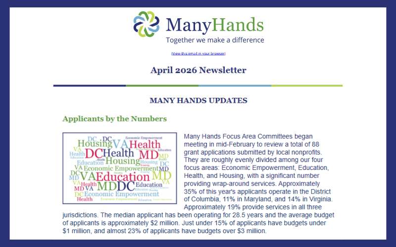 Many Hands is committed to being the most meaningful vehicle for giving in members’ lives. By leveraging the power of collective giving, we multiply the impact of donors’ gifts and engage, educate, and empower our members. Since 2004, our giving circle has welcomed more than 1000 donors to Many Hands. Members come from the District of Columbia, Maryland, and Virginia and represent a broad range of backgrounds. In Many Hands, members find a diverse community of individuals who care deeply about the challenges facing women, children, and families in under-resourced communities. By participating in the grant review process and education events, they learn about community needs in economic empowerment, education, health, and housing and about the nonprofits that work daily to address them. Many members continue to support or volunteer with organizations they have met through Many Hands.